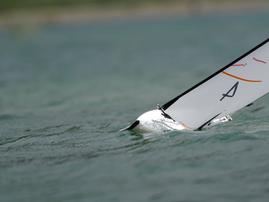 Comme pour le foc, il permet de régler l’ouverture de la bôme par rapport à l’axe du bateau. Vérifier la position de la bôme le manche de la radio tout en bas et le Trim à zéro. Voiles bordées, la bôme doit être à peu près dans la position comme sur la photo de la notice.