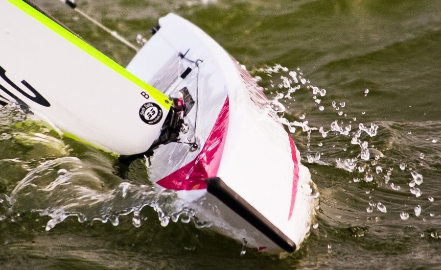 Ce réglage est probablement le plus important du bateau. Il permet de régler la longueur de l’étai. La longueur de l’étai détermine la quête du mât et par conséquent l’équilibre à la barre de votre bateau. Trop de quête et le bateau sera trop ardent, pas assez de quête et votre bateau sera mou. Vous allez devoir sans cesse corriger la trajectoire avec la barre. Bien sûr ce n’est pas l’unique facteur, le réglage des écoutes, la tension du pataras et du hale-bas influence aussi, mais c’est important de partir sur une bonne base car la quête va déterminer tous les autres réglages qui vont suivres. Avant chaque navigation vérifiez la cote de 1135mm comme indiqué dans le manuel. Pour commencer, c’est un bon point de départ pour le jeu A.
