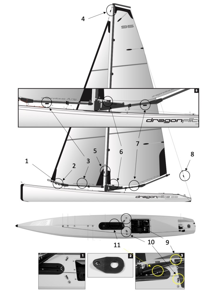 - N’utiliser pas de la ficelle trop fine, car les bowsies auront tendance à glisser et se dérégler avec le faseyemant des voiles dans la brise. Un diamètre 0.4 mm ou 0.5mm est idéal, même si au niveau résistance du 0.3 serait amplement suffisant.