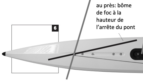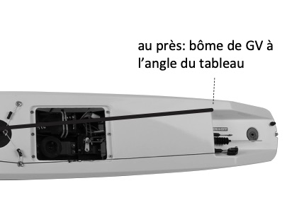 Il permet de régler la hauteur de la bôme au-dessus du pont. Normalement on cherche à avoir la bôme le plus près possible du pont. Environ 5mm de ficelle dépasse au-dessus du pontet.