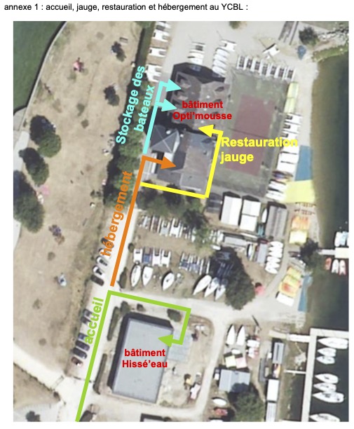 Le plan d’eau utilisé pour courir le championnat est distant de 100 mètres des locaux du club. Deux pontons flottants seront disposés pour la mise à l’eau et la sortie des voiliers. Une signalisation sera mise en place. Nous ignorons quel sera le niveau du lac lors de la compétition. Ces dispositions pourront êtres adaptées aux conditions d’alors.
