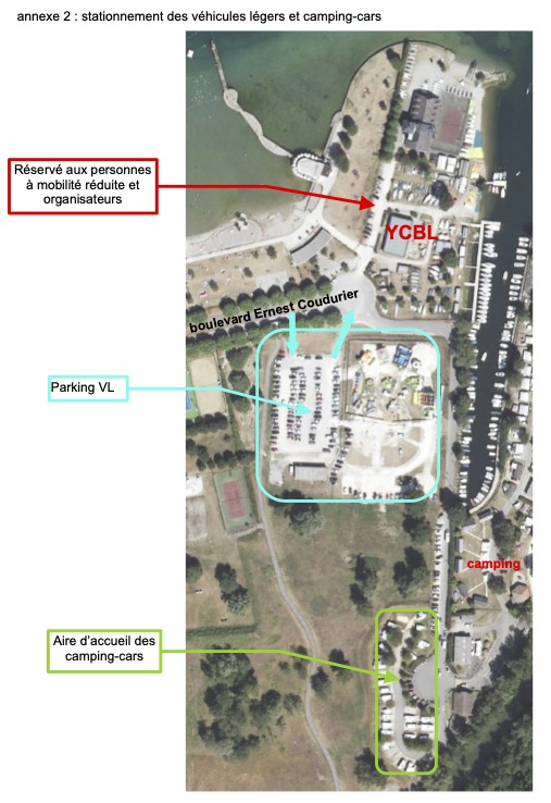 Le parking du YCBL sera réservé aux organisateurs et aux personnes à mobilité réduite. Les concurrents, après avoir déchargé leur matériel au club, devront stationner leur véhicule sur le parking de l’autre côté du boulevard Ernest Coudurier. Ce parking est équipé d’un portique limitant l’accès aux véhicules de 2 mètres de hauteur maximum.